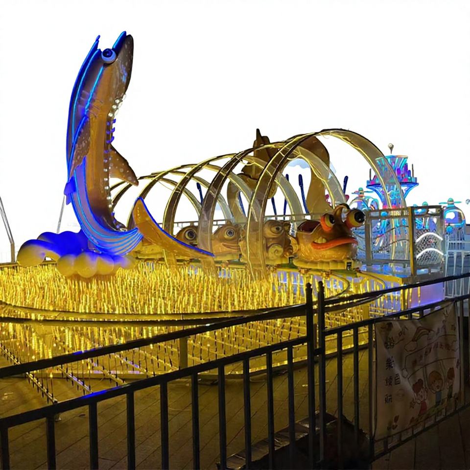 เครื่องเล่นสวนสนุกสำหรับครอบครัวราคาประหยัด รถไฟเหาะขนาดเล็กสำหรับงานรื่นเริงเด็ก รูปแบบปลา วัสดุไฟเบอร์กลาสและเหล็ก รับน้ำหนักได้มาก