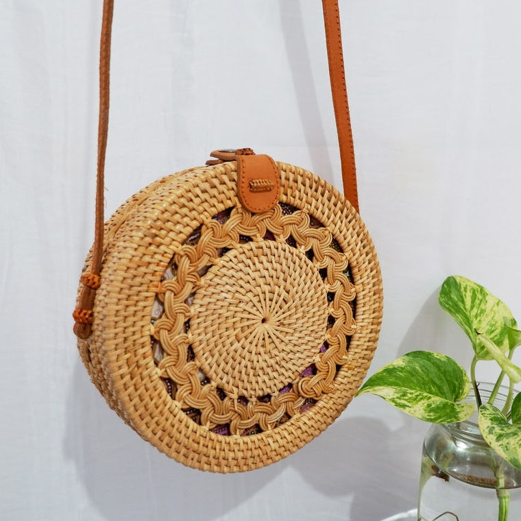 กระเป๋าหวายทรงกลมที่มีลวดลายถักเปียสองชั้น
