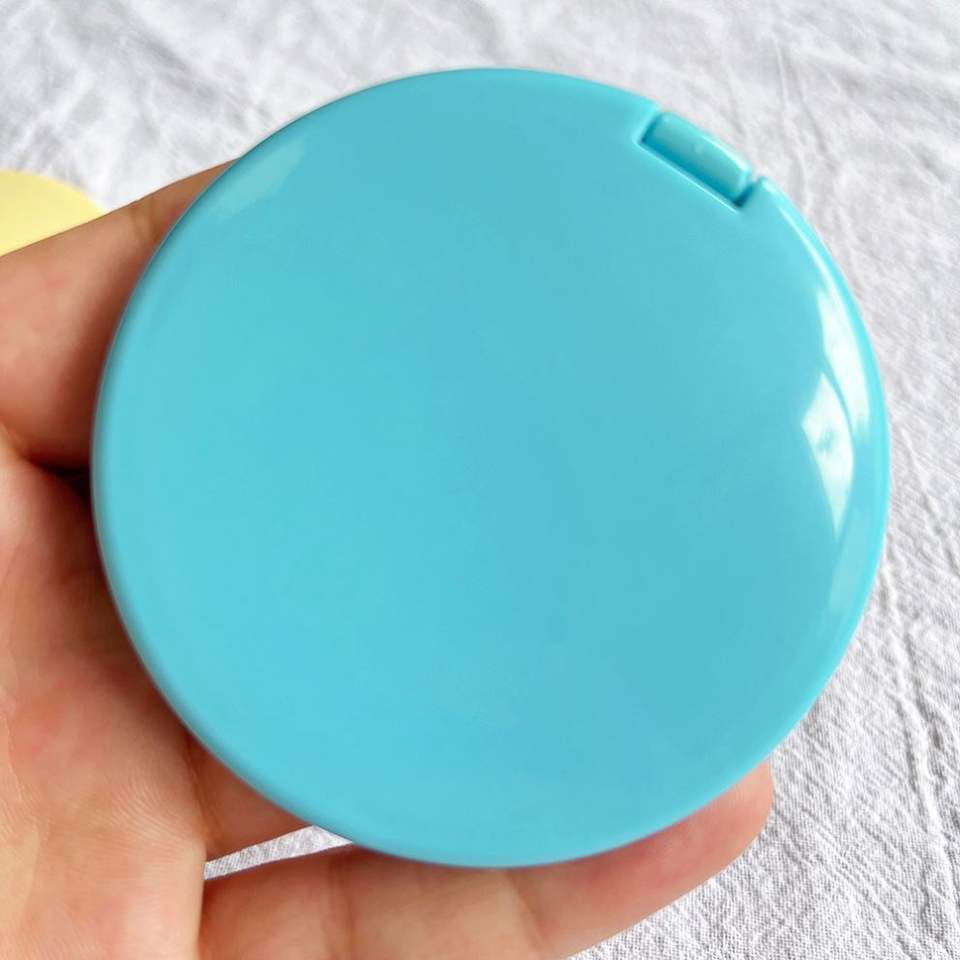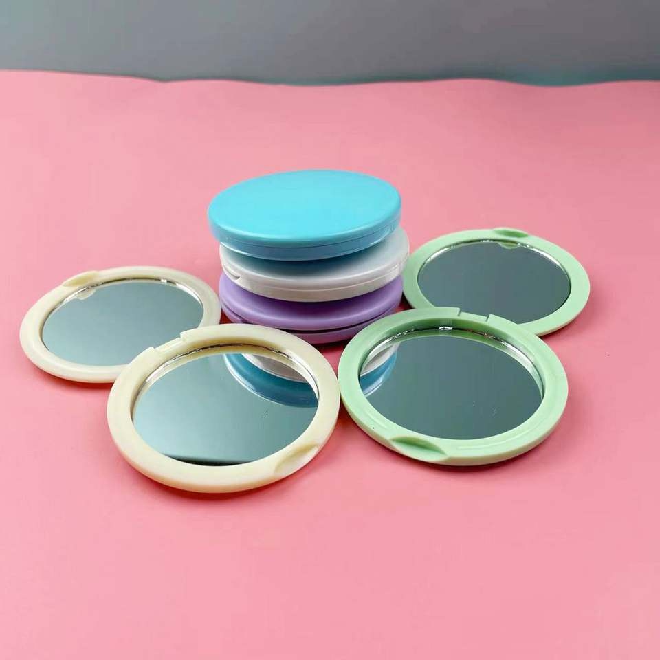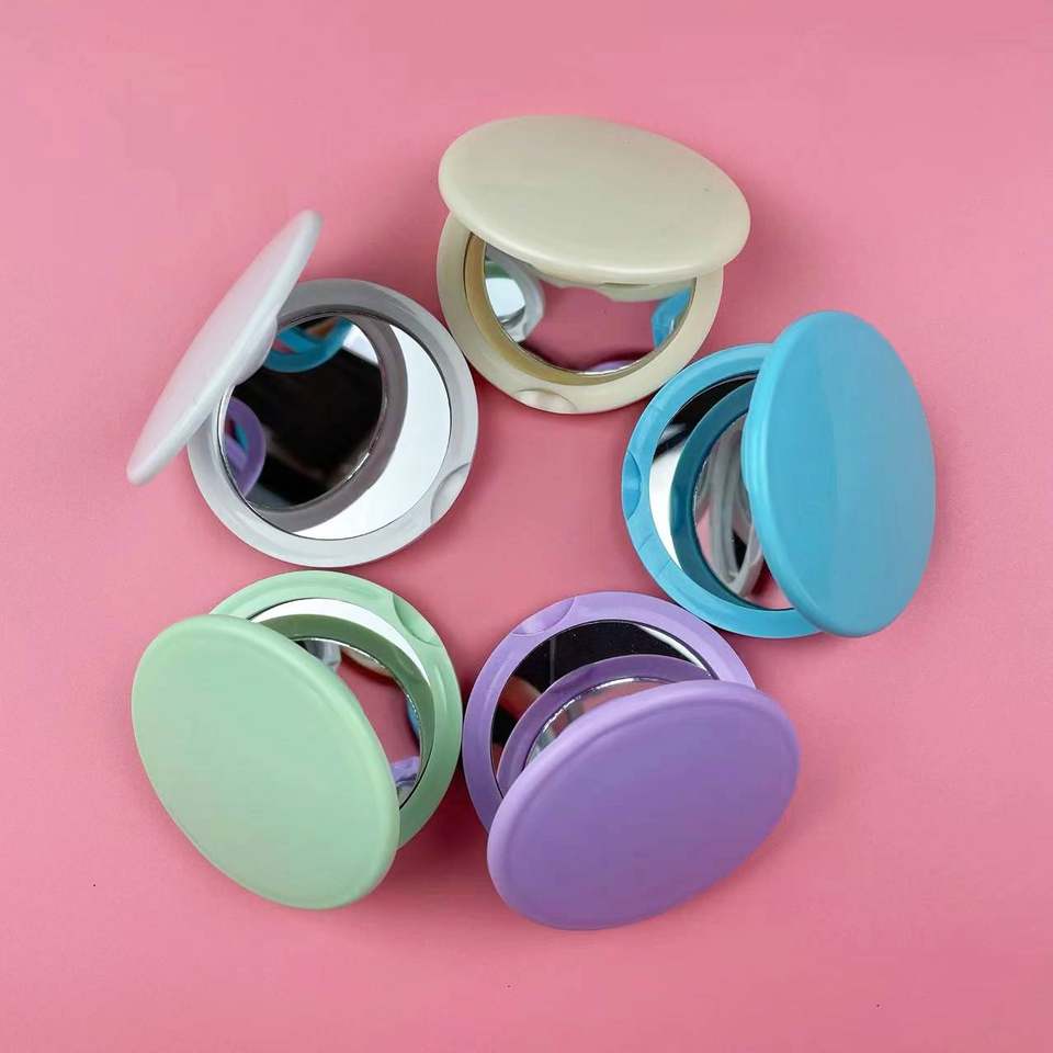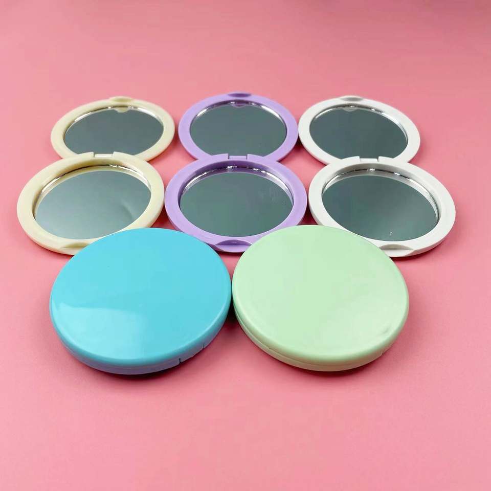กระจกพกพาพลาสติกราคาถูก ทรงกลม สีชมพู กระจกพับสองด้าน กระจกพับขนาดกะทัดรัดสำหรับเครื่องสำอาง