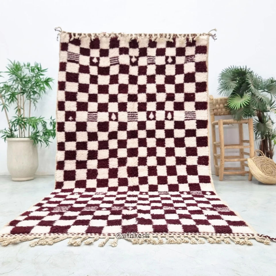 พรมเบนิอูเรียนลายตารางหมากรุกแบบโมร็อกโก ทำด้วยมือจากขนสัตว์ ตกแต่งด้วยสีขาวและสีน้ำตาลแดง พรมเบอร์เบอร์แท้ ราคาโรงงาน
