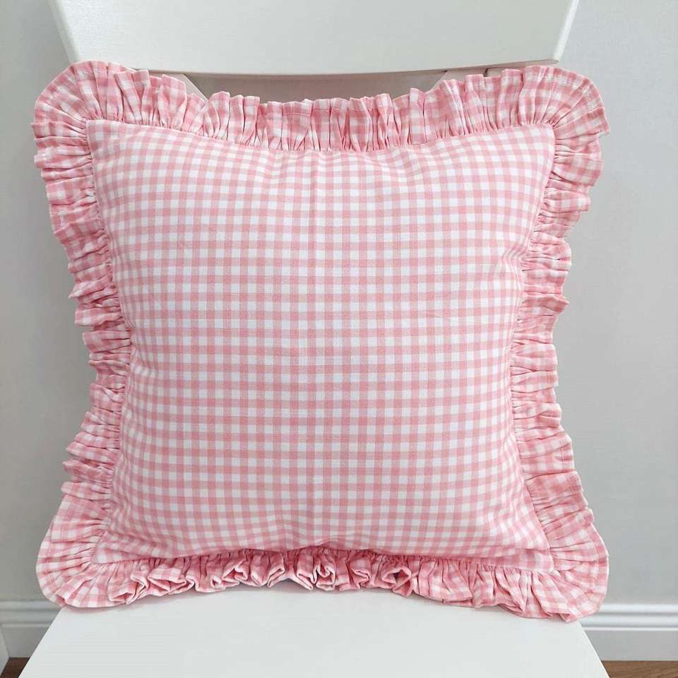 หมอนผ้าฝ้ายโบฮีเมียนลายตารางหมากรุกลายทางแต่งระบายหมอนโยนแต่งระบายเป็นชั้นๆหมอนออกแบบสไตล์โบฮีเมียนโดย ithl