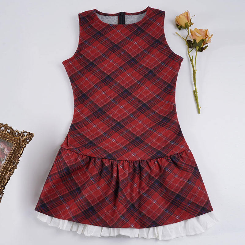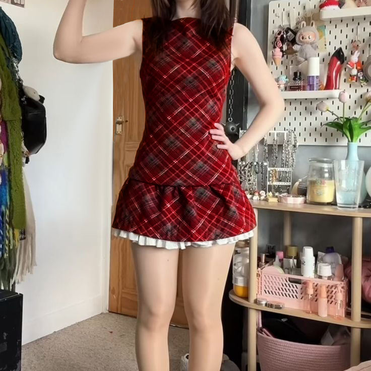 ชุดเดรสแขนกุดลายตารางหมากรุกพร้อมกระโปรงจีบสีสันตัดกัน สไตล์ลำลองสำหรับผู้หญิง แฟชั่นแนวสตรีท