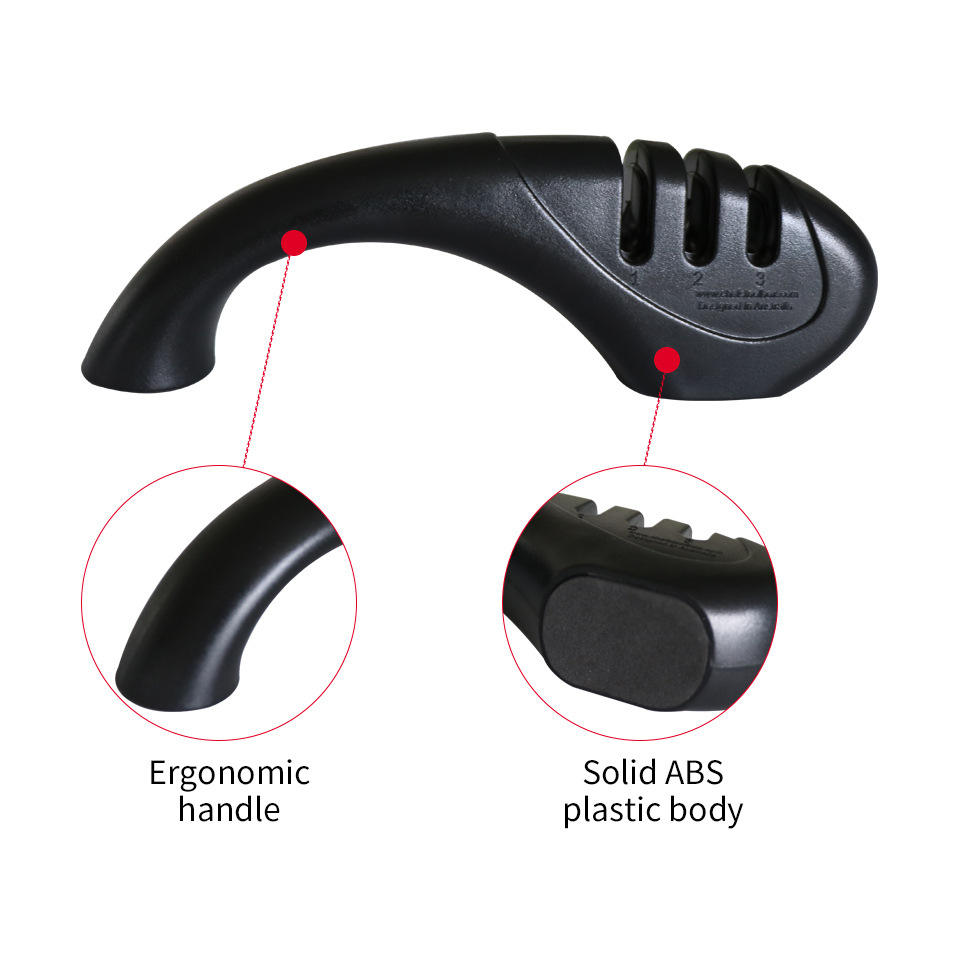 เครื่องลับมีดเชฟ'ส์ช้อยส์ แบบแมนนวล หลายระดับความหยาบ ผลิตจากเหล็กคาร์บอน พร้อมหินลับมุมคงที่ ด้ามจับตามหลักสรีรศาสตร์ ตัวเครื่องทำจากพลาสติก ABS แข็งแรง