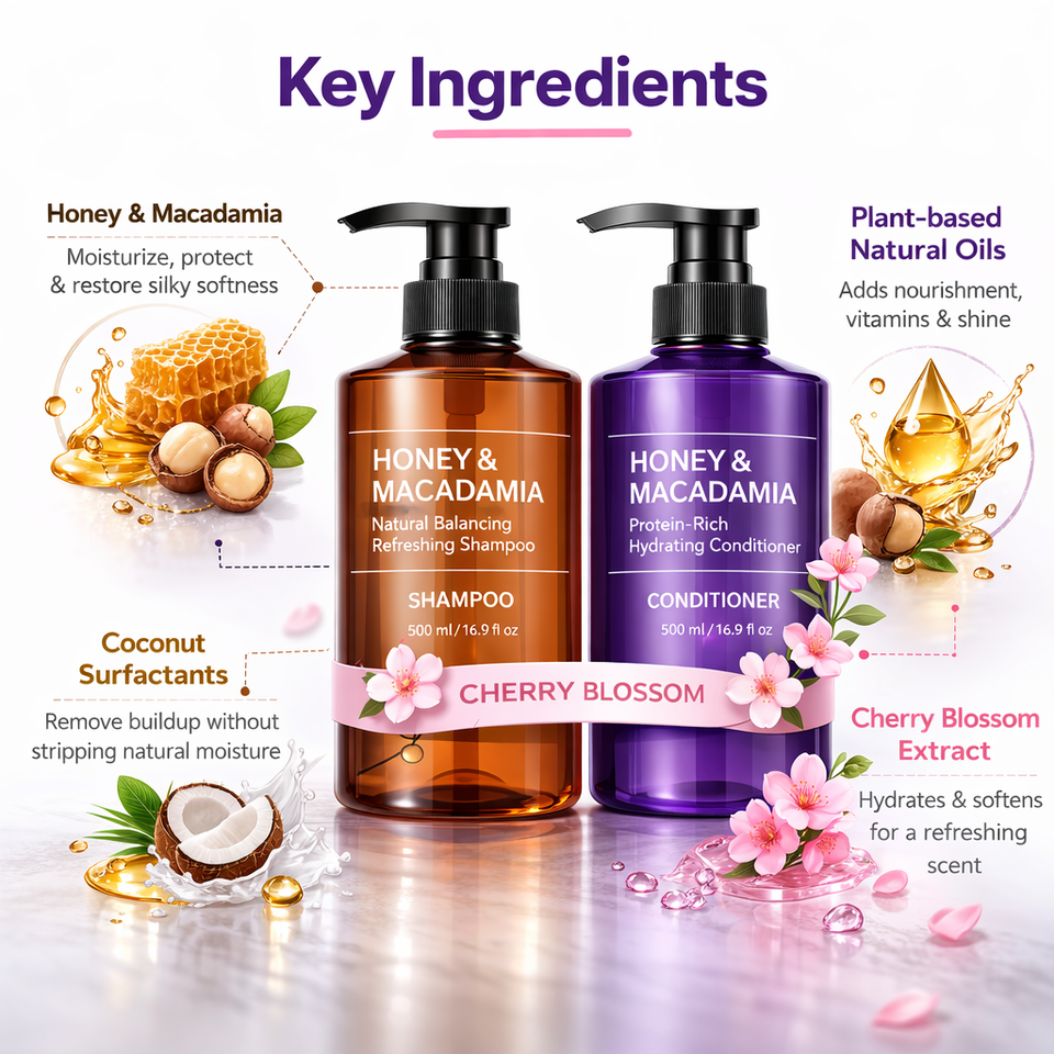 ชุดแชมพูและครีมนวดผมเชอร์รี่บลอสซัม บำรุงผมชุ่มชื้น เรียบลื่น บำรุงล้ำลึก สำหรับผมมัน ด้วยน้ำมันอาร์แกนและแมคคาเดเมีย รับผลิตแบบ OEM แบรนด์ส่วนตัว