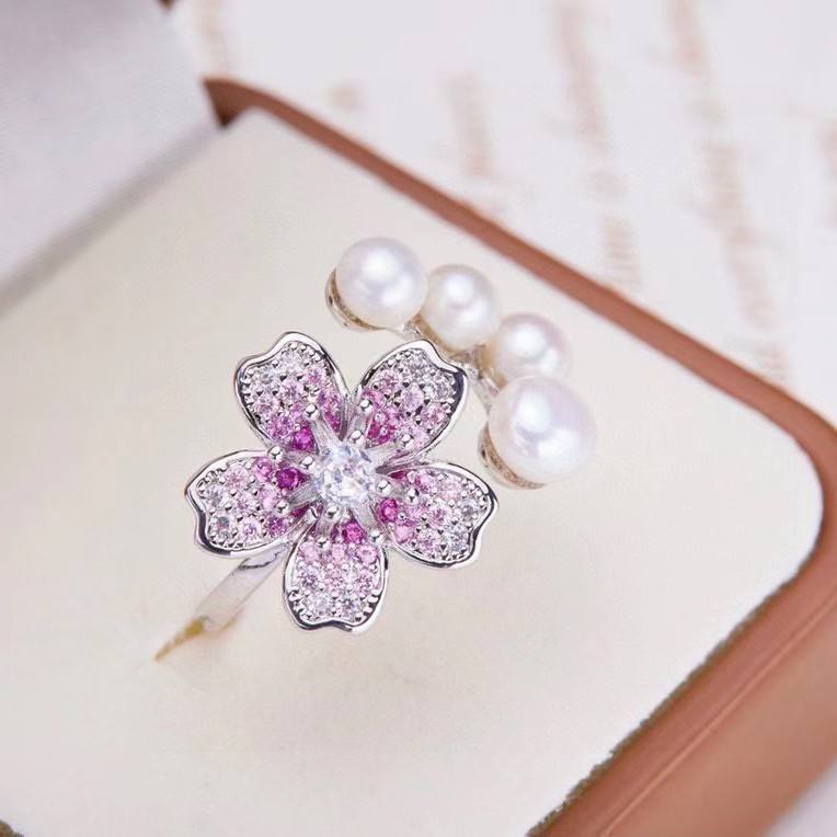 ชุดเครื่องประดับมุกน้ำจืดสไตล์ดอกซากุระ ประกอบด้วยจี้ ต่างหู แหวน - งานออกแบบทำมือ
