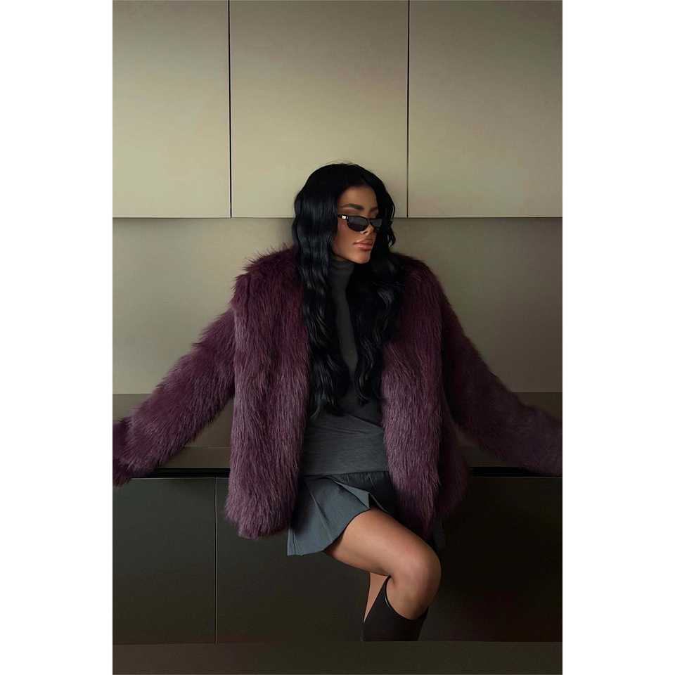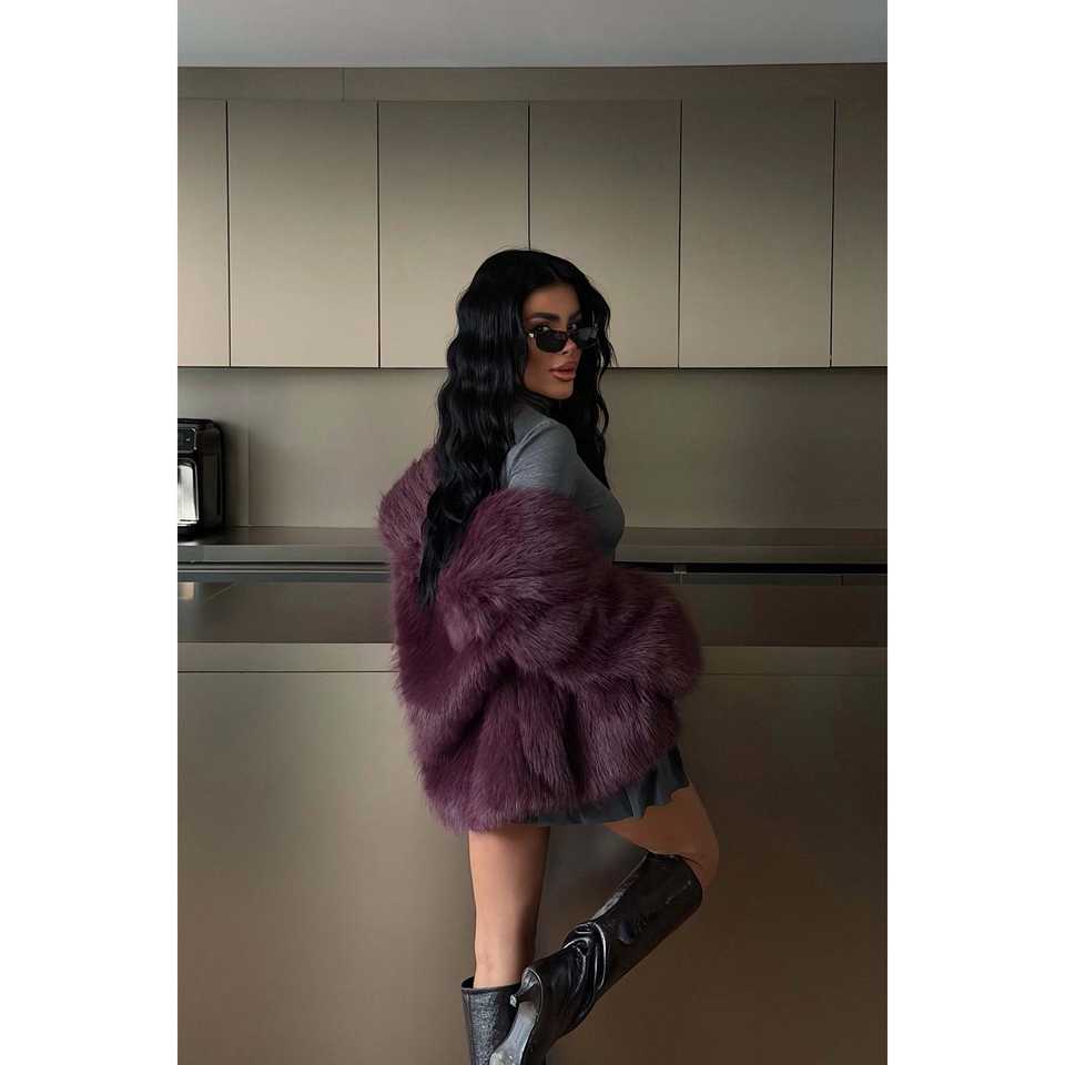 เสื้อโค้ทขนเฟอร์สีแดงเชอร์รี่ รุ่นรูฟิน่า ตกแต่งกระดุมวินเทจ ทรงเข้ารูปกระดุมแถวเดียว บุด้วยขนคาเมล ทำจากผ้าไหมผสมขนสัตว์