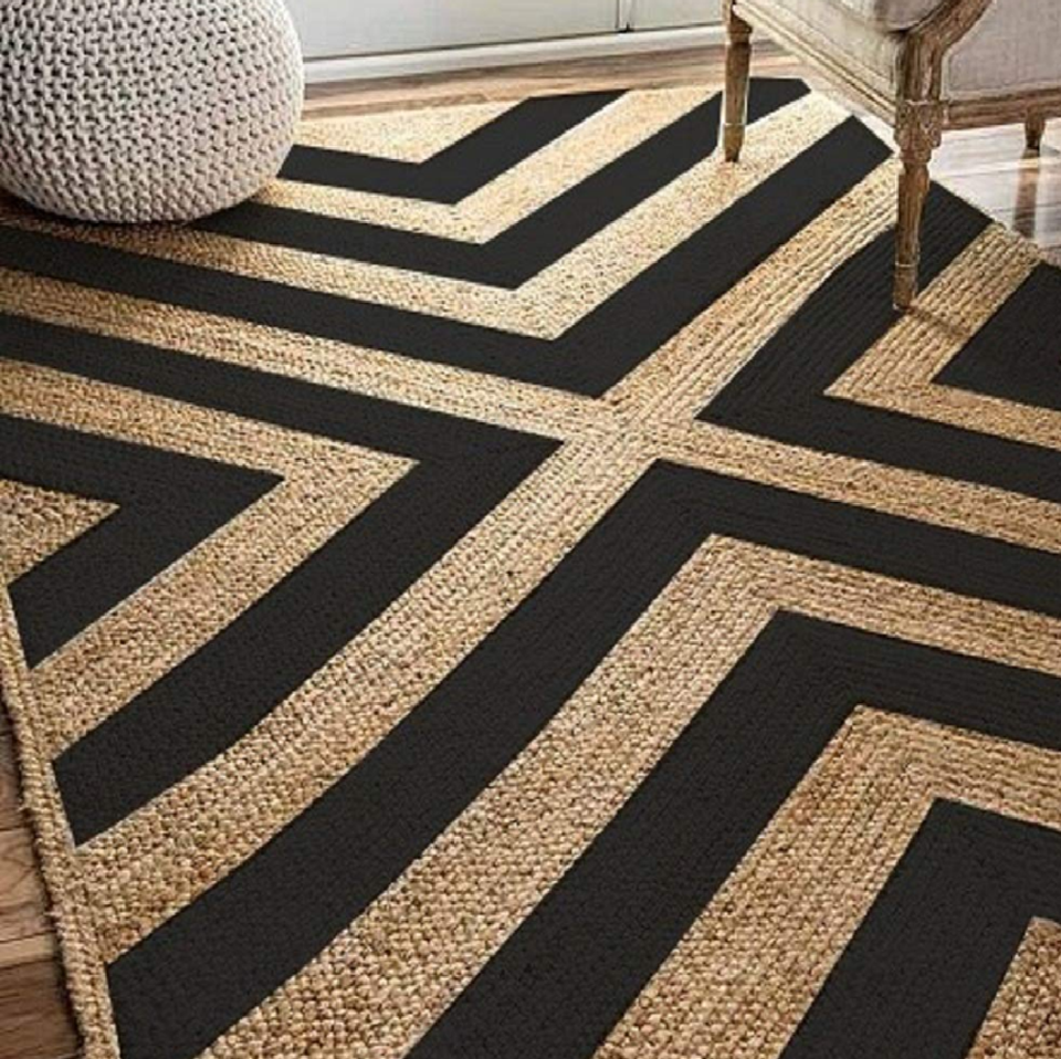 พรมปอกระเจาลายเชฟรอนพร้อมซิกแซกธรรมชาติสีดำหนาสำหรับห้องนั่งเล่นห้องนอนห้องโถงโรงแรมสำนักงาน