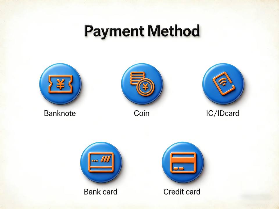 วิธีการชำระเงินหลายวิธี:ธนบัตร, เหรียญ, บัตรเครดิต (ตัวเลือก)