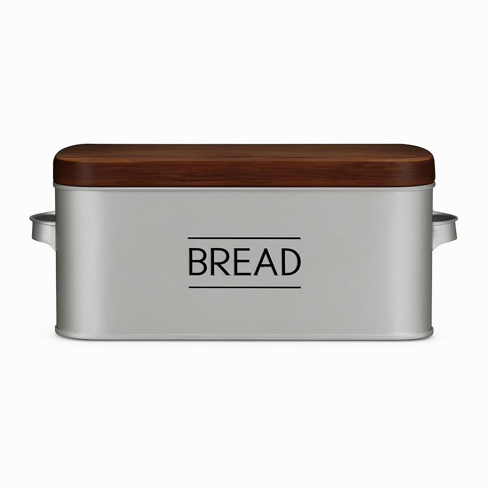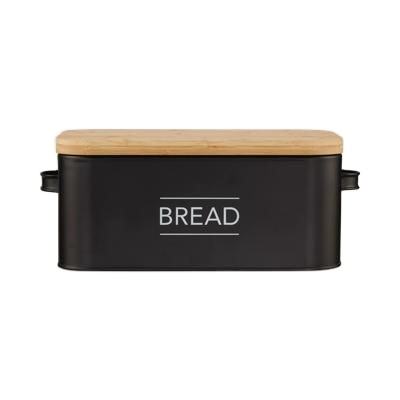 กล่องขนมปังโลหะสีดำเก๋ไก๋พร้อมฝาไม้ที่เก็บของในครัวที่หรูหราและกว้างขวางสำหรับม้วนขนมปังและสินค้าอบอื่นๆ