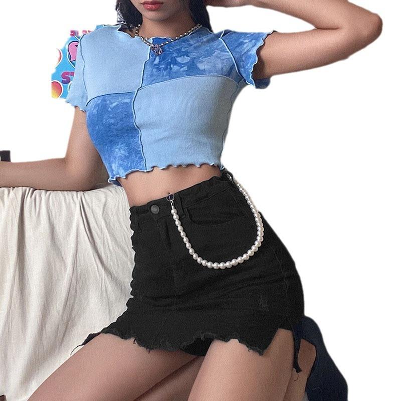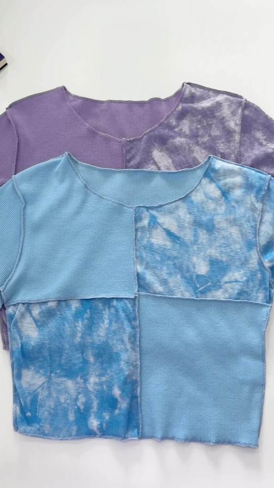 Chic Crop Tops Tees Tie Dye With Sequin Patchwork Women Summer T-shirts Ruffles Hem Purple Or Bule Clothes