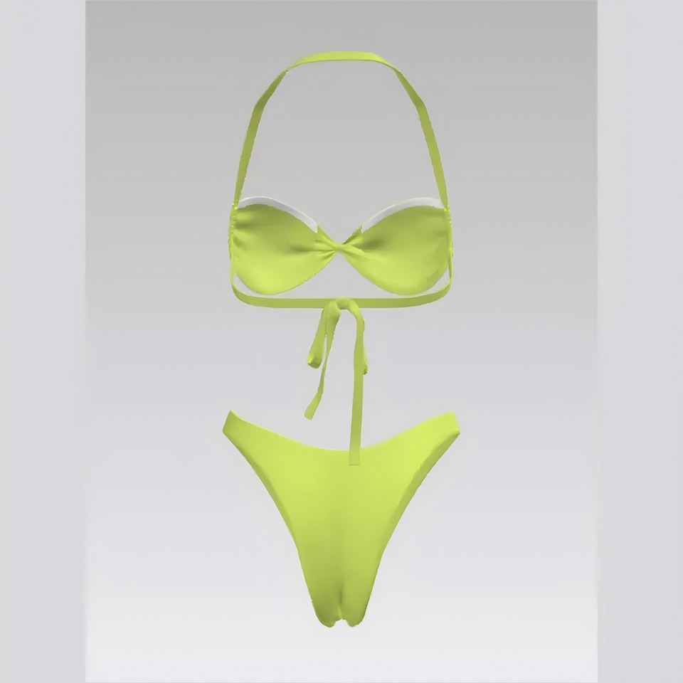 ชุดบิกินี่แบบผูกคอทรงเก๋ไก๋พร้อมดีไซน์ผูกด้านหลังและกางเกงทรงวีคัทเพื่อทรงสวยเหมาะกับชายหาด