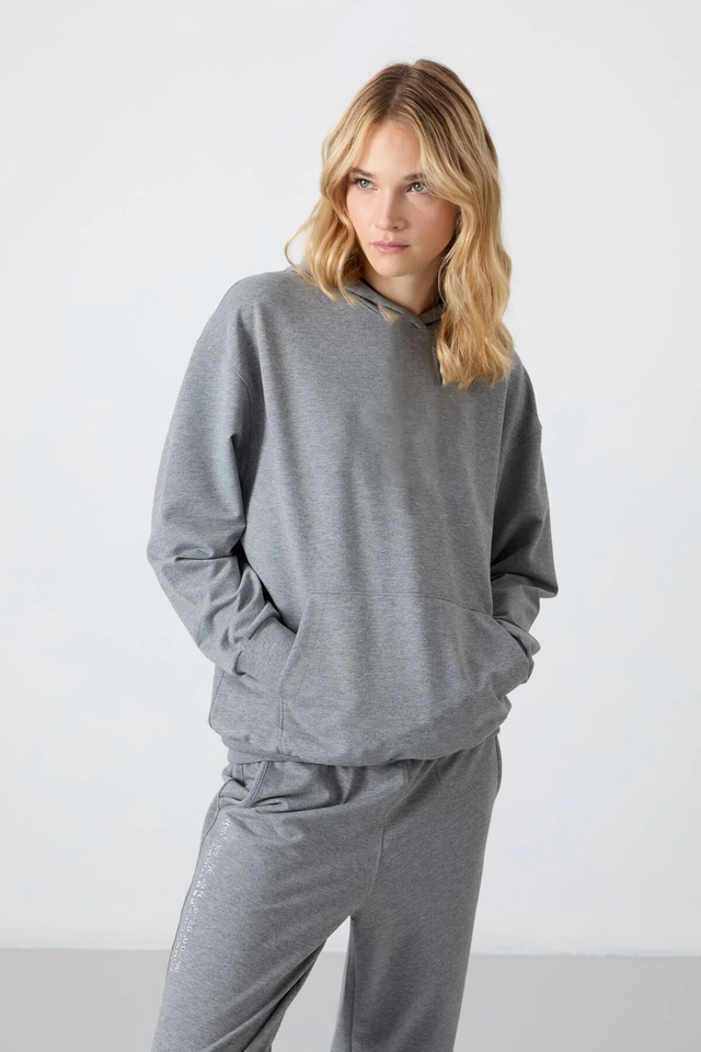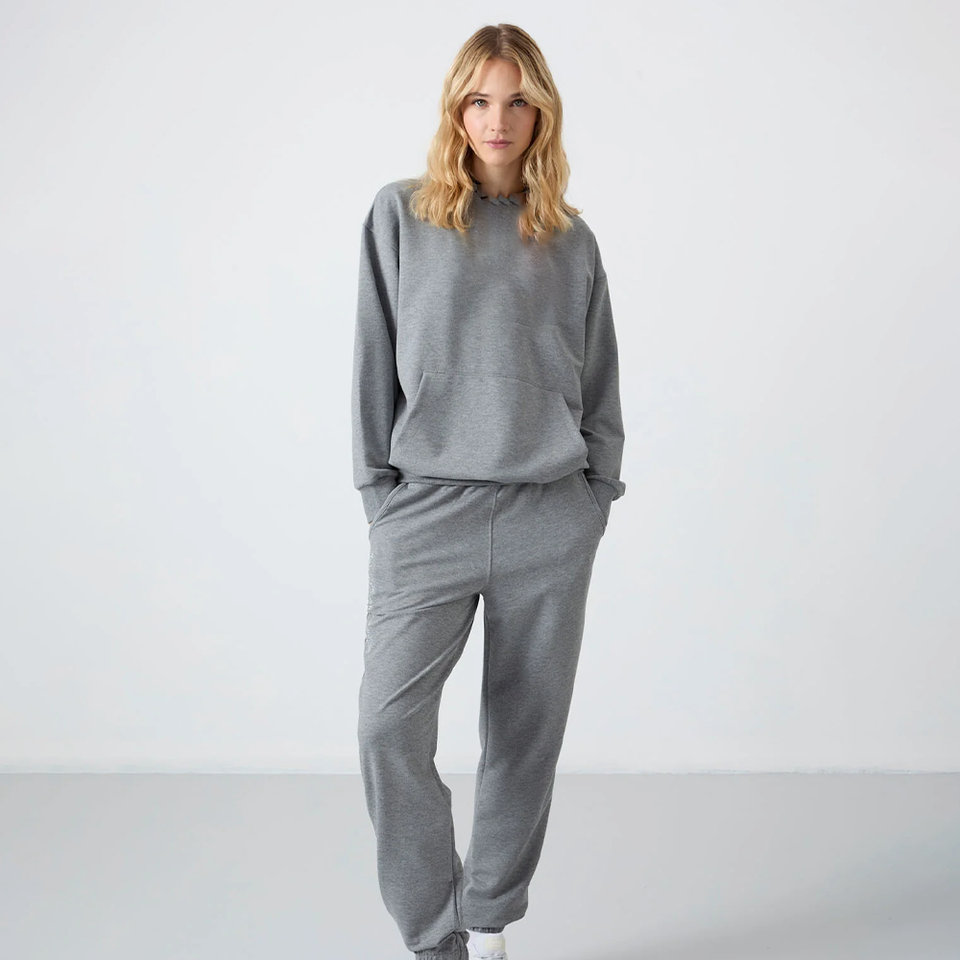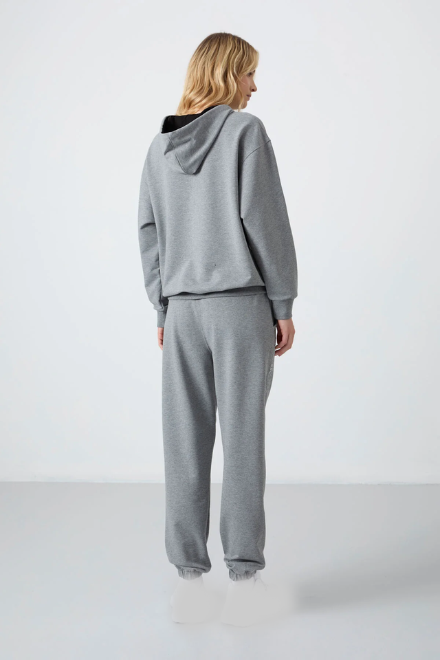 ชุดเสื้อผ้าใส่อยู่บ้านสีเทาชิคเสื้อมีฮู้ดและกางเกงวอร์มคุณภาพระดับพรีเมียมสวมใส่สบายและสวมใส่สบายทันสมัยทุกโอกาส
