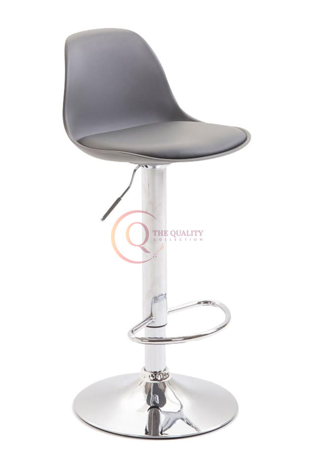 เก้าอี้บาร์เก๋ไก๋ทันสมัยพร้อมที่นั่งโค้งสีดำและฐานโครเมี่ยมที่ทันสมัยเหมาะสำหรับห้องครัวหรือบาร์ที่มีสไตล์