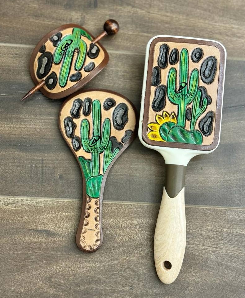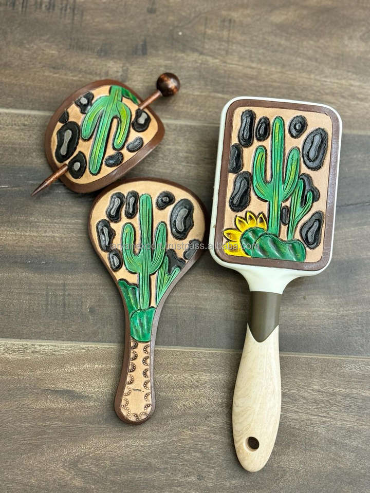 Chic หนังแท้ชุดโต๊ะเครื่องแป้ง Trio สไตล์ Handtooled หนัง 3 ชิ้นแปรงผมกระจกมือ & Hair Stick ที่สมบูรณ์แบบของขวัญวันครบรอบ