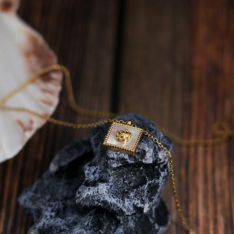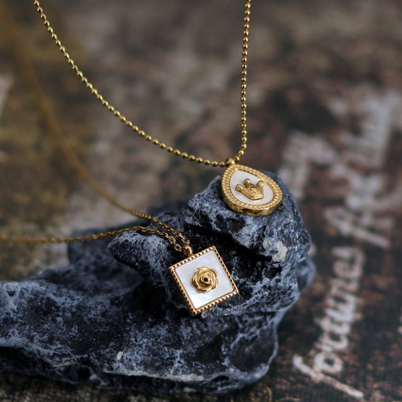 สร้อยคอแฟชั่นสไตล์เรโทรชุบทอง 18K ทำจากสแตนเลสสตีลสำหรับผู้หญิง รูปทรงหยดน้ำ มงกุฎ สี่เหลี่ยม ดอกกุหลาบ เปลือกหอยสีขาว ของขวัญสำหรับงานหมั้น