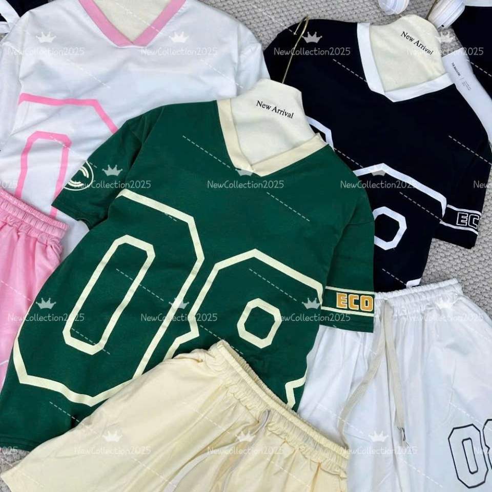 เสื้อยืดคอกลมเก๋ที่มีดีไซน์ตัวเลขหนาและกางเกงขาสั้นสีสดใสเหมาะสำหรับการโชว์สไตล์วัยรุ่นของคุณ