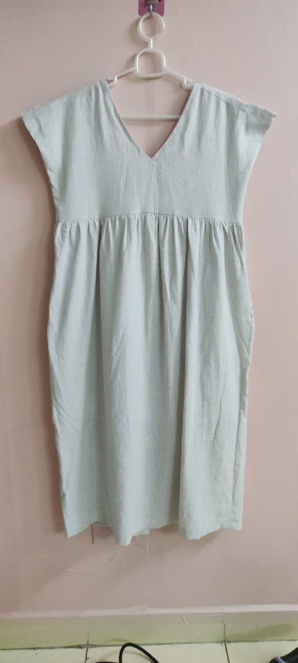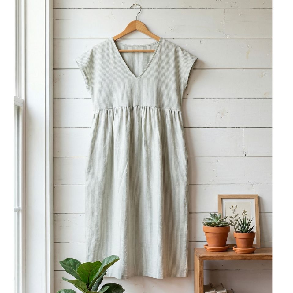 ชุดเดรสแขนสั้นลายทางสุดชิคสำหรับผู้หญิง เดรสผ้าฝ้ายคอวีทรงหลวม ใส่สบายและระบายอากาศได้ดี เหมาะสำหรับฤดูร้อน