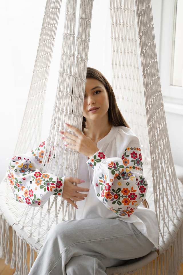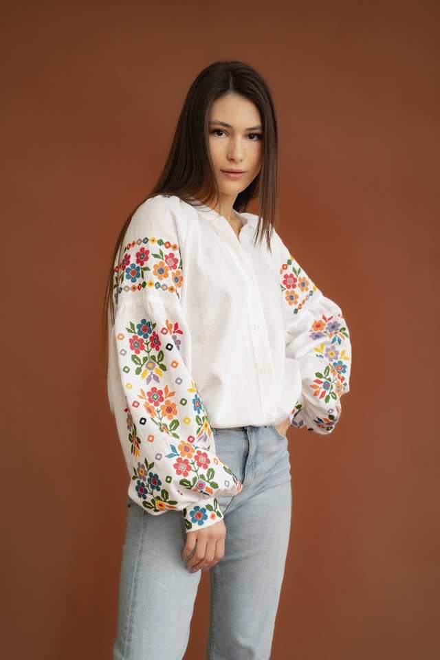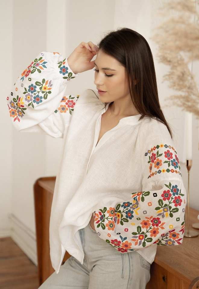เสื้อเบลาส์ผ้าลินินแท้ยูเครนสุดชิคพร้อมการปักแบบดั้งเดิมสีสันสดใสในการออกแบบผ้าอิตาลีระดับพรีเมียม