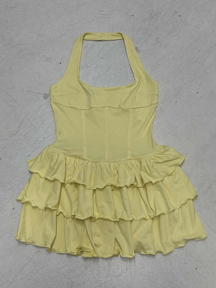 เดรสคล้องคอทรงสี่เหลี่ยมสไตล์วันหยุดสุดชิคมินิเดรสสั้นคล้องคอสีล้วนเอวไลน์