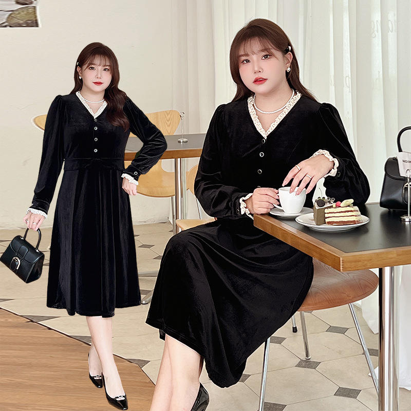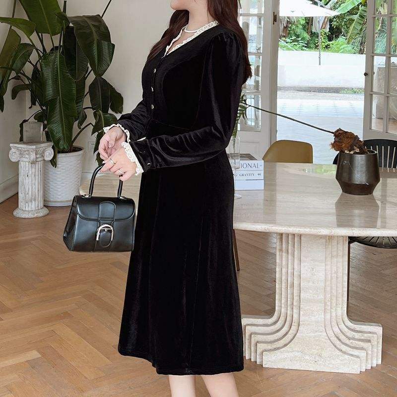 ชุดราตรีผ้ากำมะหยี่ทรงเอไลน์ คอวี สำหรับผู้หญิงไซส์พลัส สีดำล้วน สไตล์วินเทจ เอวทรงเอ็มไพร์ แขนยาว ลิตเติ้ลบลัค