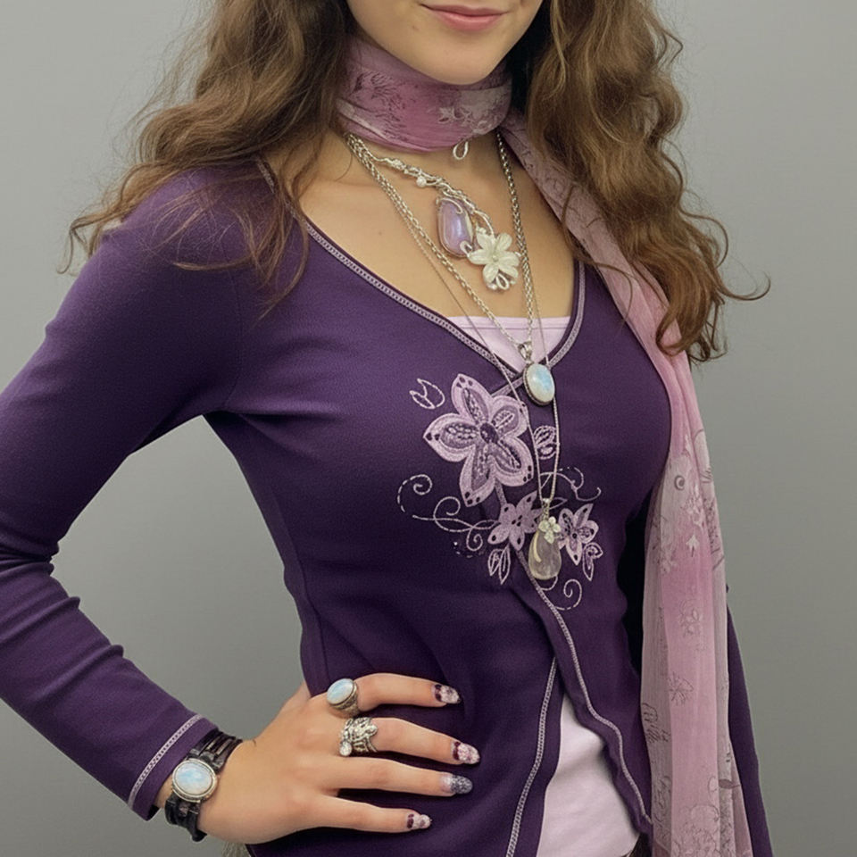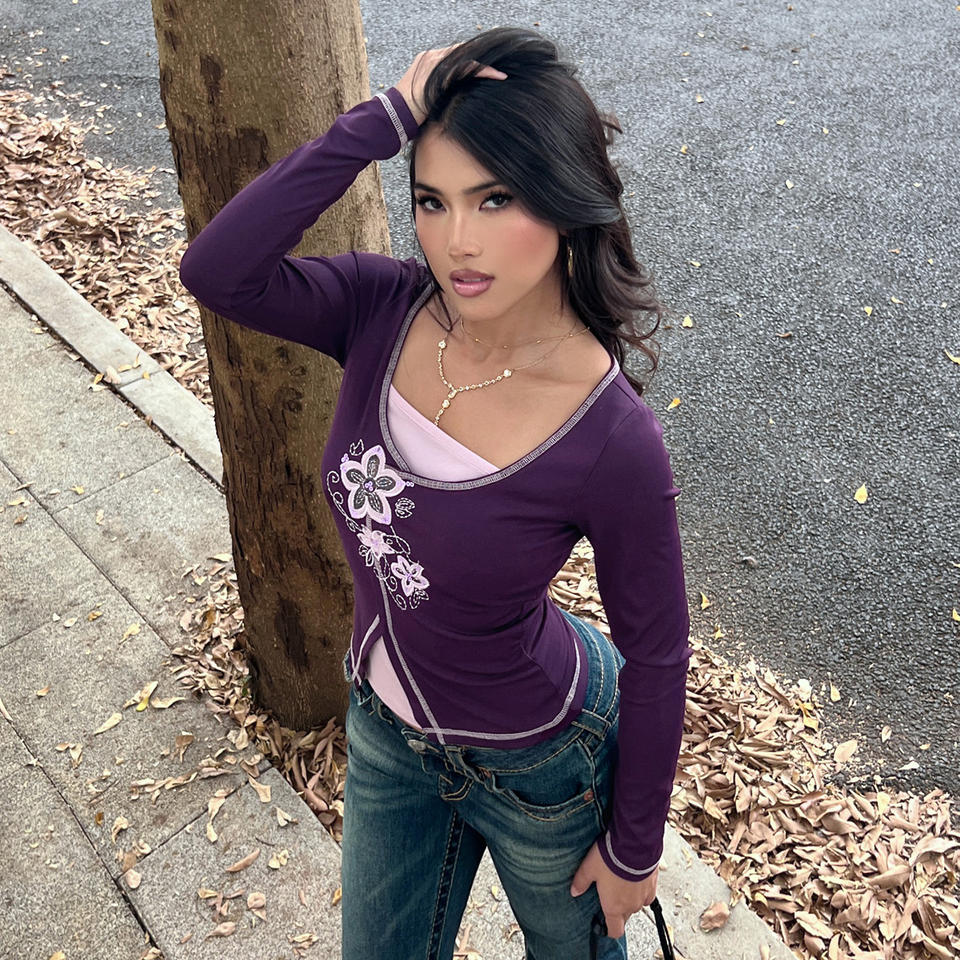เสื้อท็อปแขนยาวปักลายสไตล์วินเทจเก๋ไก๋สำหรับผู้หญิง คอวีทรงเข้ารูป ดีไซน์เลเยอร์แบบเสื้อยืดสองชิ้น สตรีทแวร์