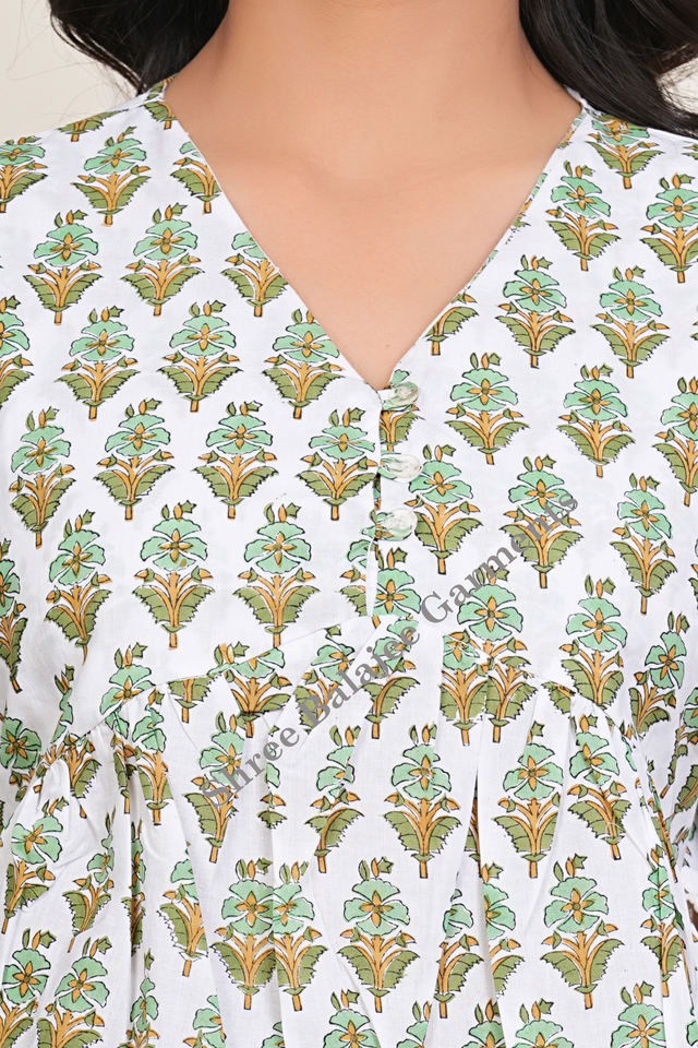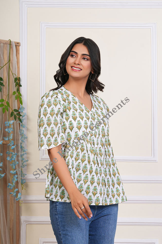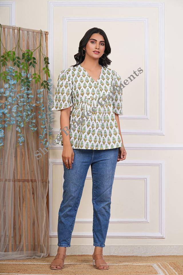เสื้อคอวีผ้าฝ้ายสีขาวสุดชิคเสื้อพิมพ์ลายดอกไม้สีเขียวอ่อนลายดอกไม้แขนสั้นสไตล์ peplum เป็นมิตรต่อสิ่งแวดล้อมซักได้ลำลองธรรมชาติ