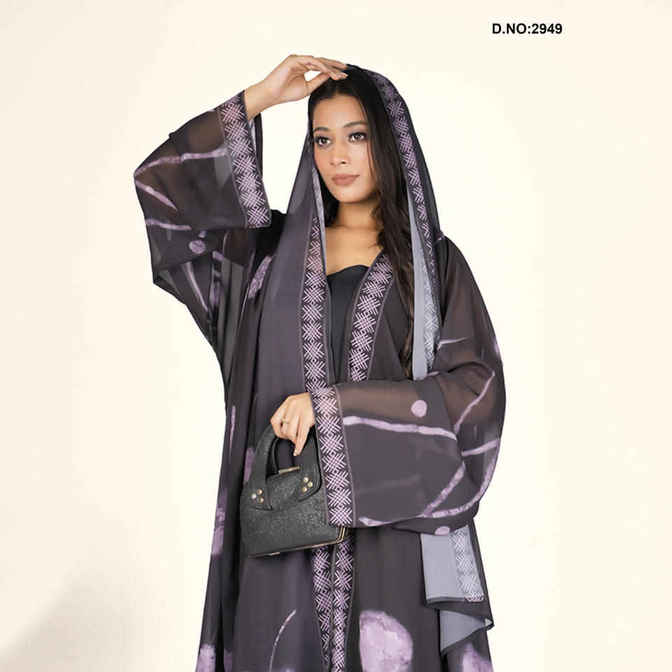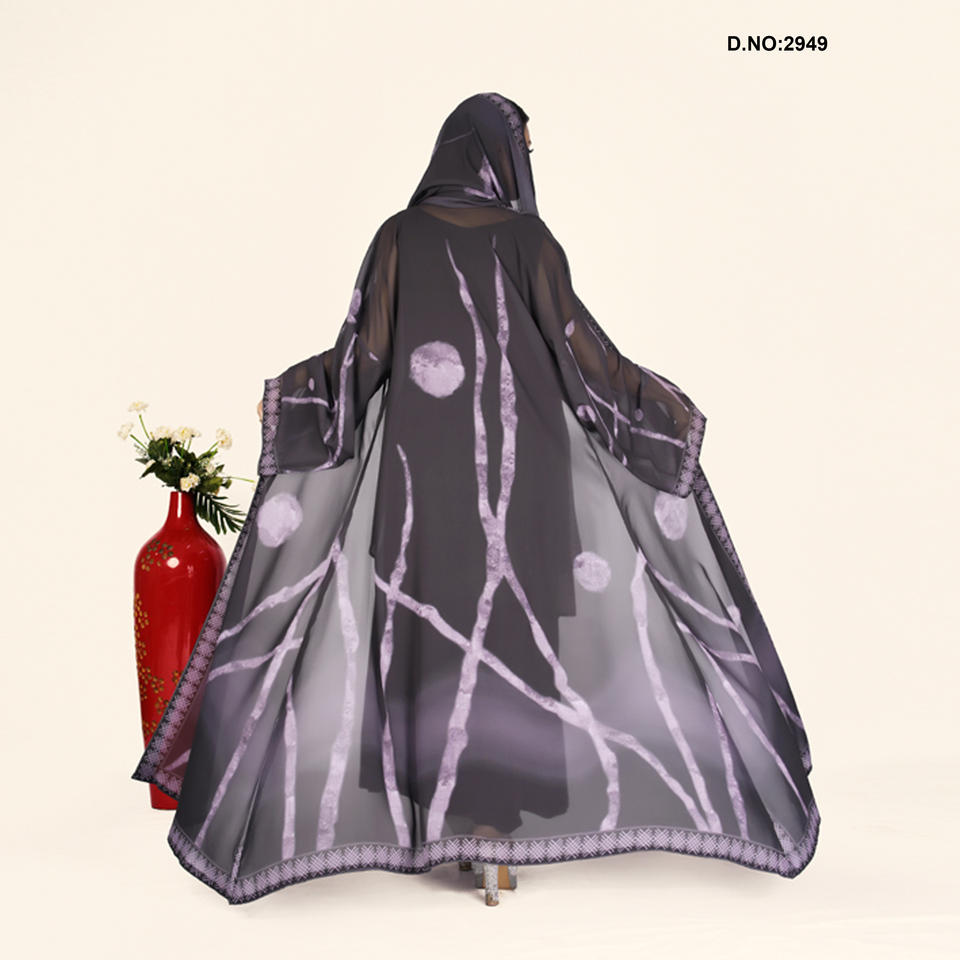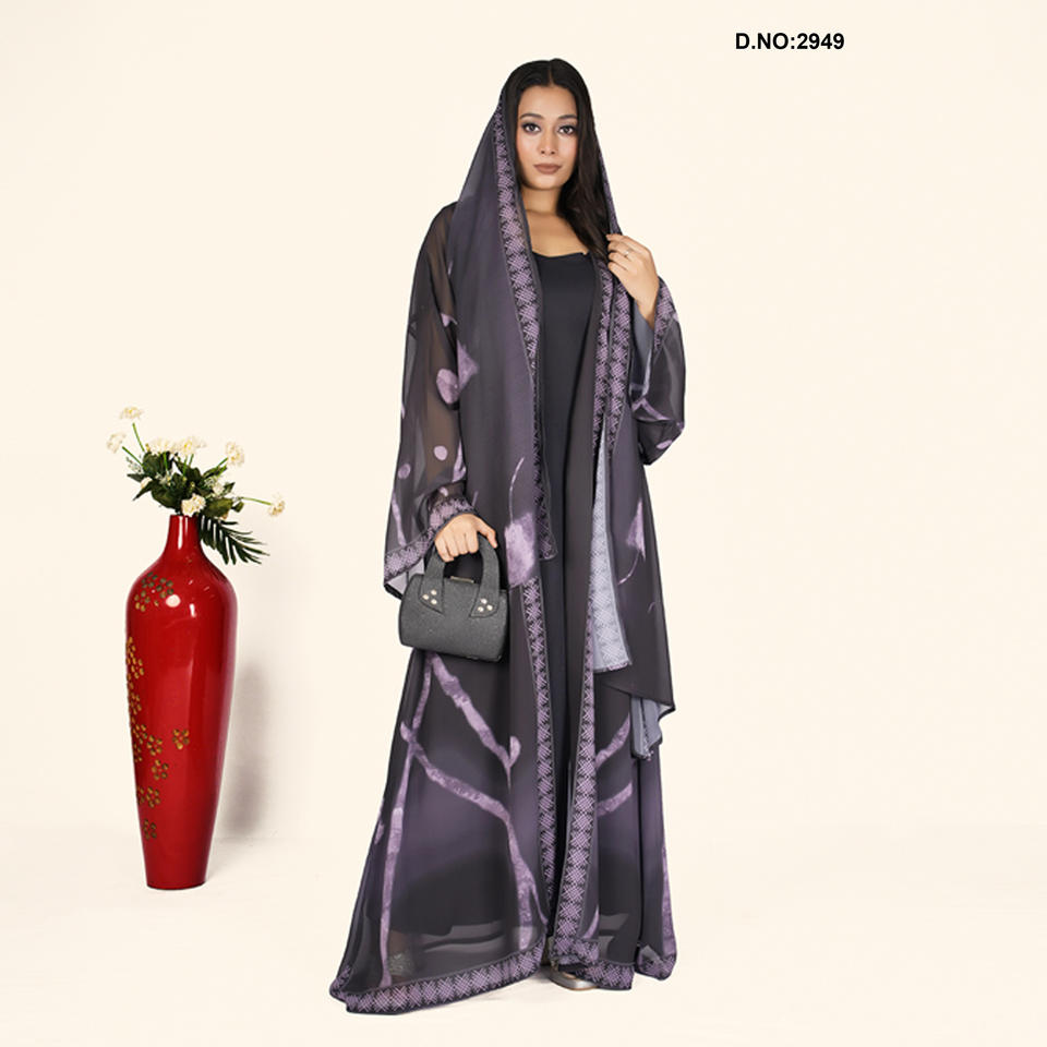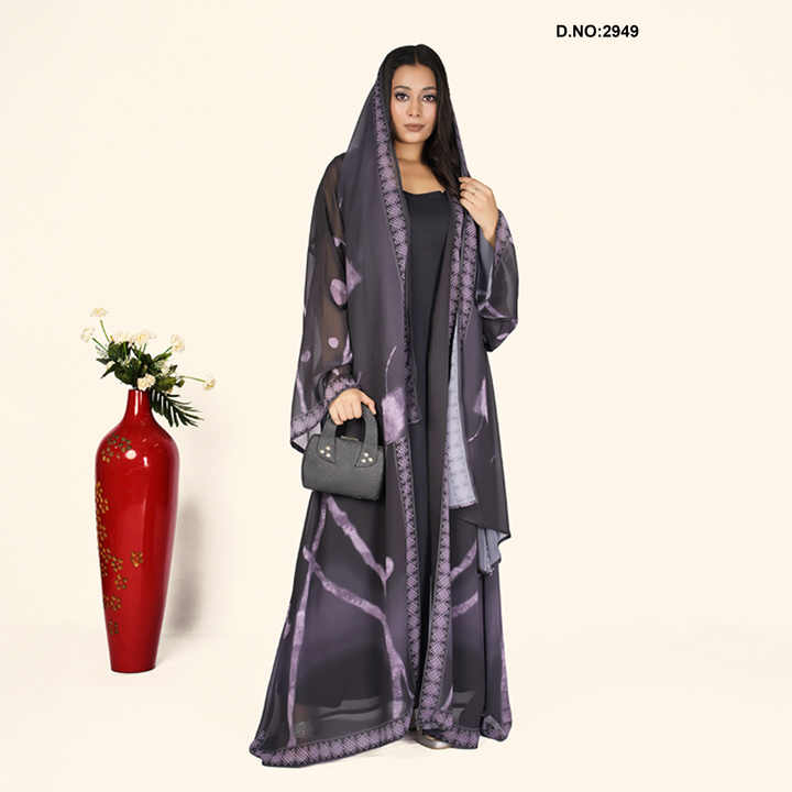 เสื้อคลุมชีฟองพิมพ์ลายแบบเปิดด้านหน้า สไตล์อาบายะ พร้อมฮู้ด แต่งขอบด้วยผ้า ชุดสุภาพเรียบร้อย ความยาวเต็มตัว ทรงพลิ้วไหว
