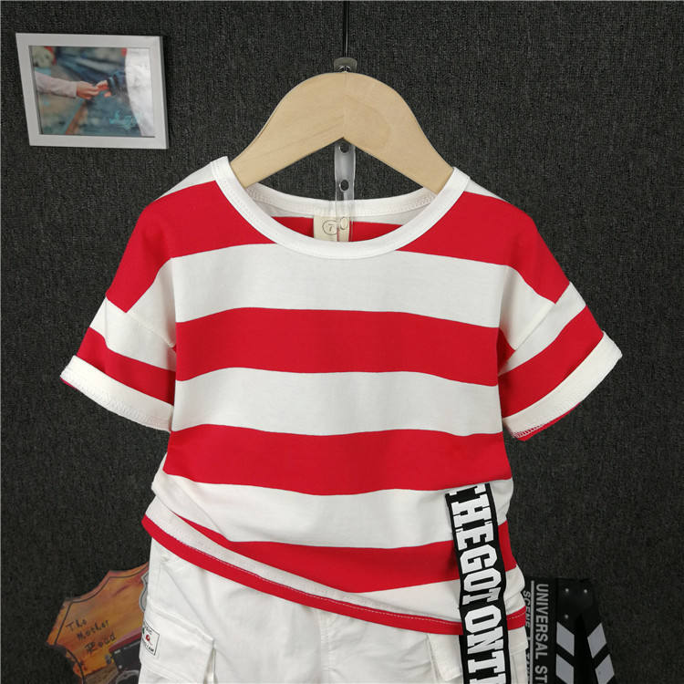 เสื้อผ้าเด็ก ชุดกีฬา เสื้อยืดลายทางสีขาวแดง และกางเกง
