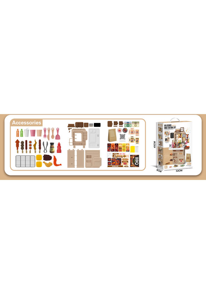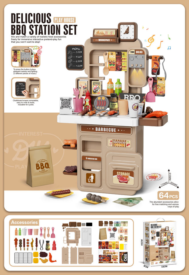 ชุดของเล่นบ้านเชฟทำอาหารสำหรับเด็ก ขนาด 61 ซม. พร้อมเตาบาร์บีคิว ของเล่นครัว 64 ชิ้น โต๊ะอาหารพร้อมไฟและเสียงเพลง กระดานเขียนสำหรับเด็ก