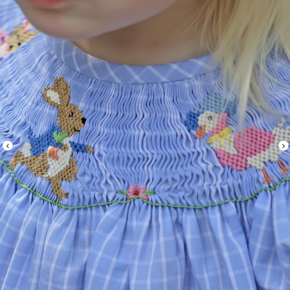 เสื้อผ้าเด็กสาวชุดสม็อคกับกระต่ายกระต่ายเย็บปักถักร้อยออกแบบเอง OEM ODM ขายส่งจากเวียดนาม
