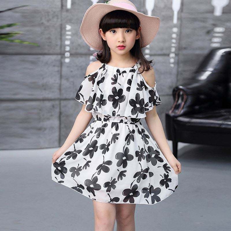 เสื้อผ้าเด็ก สไตล์เกาหลี ชุดเดรสเด็กผู้หญิง ชุดเดรสปาร์ตี้สีขาว พิมพ์ลายดอกไม้สีดำ