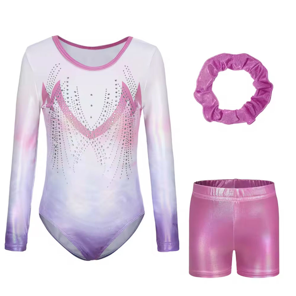 ชุดเต้นสำหรับเด็กผู้หญิงชุดรัดรูปเล่นยิมนาสติกผ้าโพลีเอสเตอร์พร้อมกางเกงขาสั้นชุดบอดี้สูทแขนยาวประดับพลอยเทียม