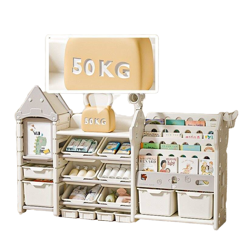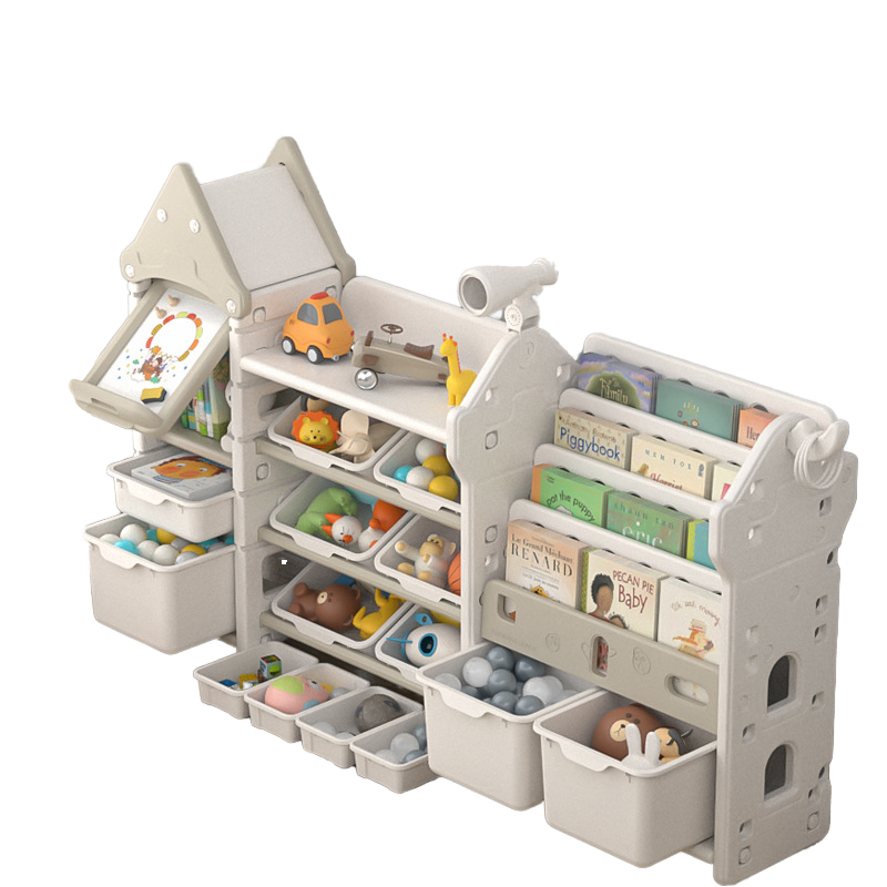 ชั้นวางของเล่นเด็กแบบหลายชั้น ชั้นวางหนังสือในบ้าน และตู้เก็บของพร้อมกระดานวาดภาพ ลายการ์ตูนสำหรับเด็ก