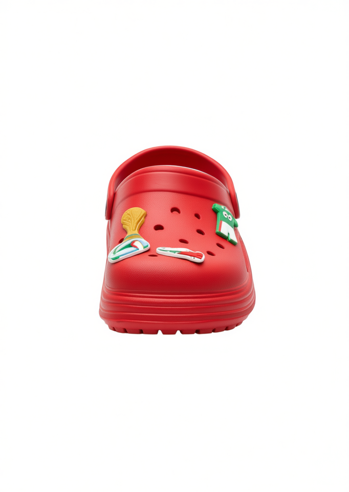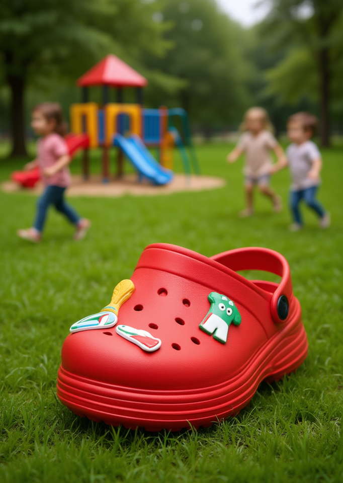 รองเท้าแตะเด็กสีแดง ไซส์ 22 พร้อมเข็มกลัดลายการ์ตูน หน้าผ้าพลาสติก พื้นรองเท้า EVA
