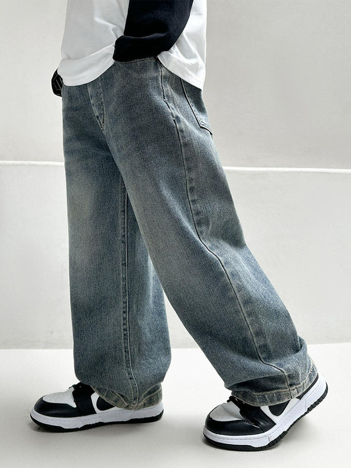 กางเกงผ้าฝ้ายขากว้างแห้งเร็วสำหรับเด็กผ้าเดนิมซักปานกลางแนวย้อนยุคสำหรับ100% ฤดูใบไม้ร่วง