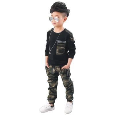ชุดเด็กผู้ชาย รุ่นฤดูใบไม้ผลิและฤดูใบไม้ร่วง ชุดใหม่แบบมีฮู้ดลายพราง เสื้อผ้าเด็กสองชิ้น ชุดเด็กโต