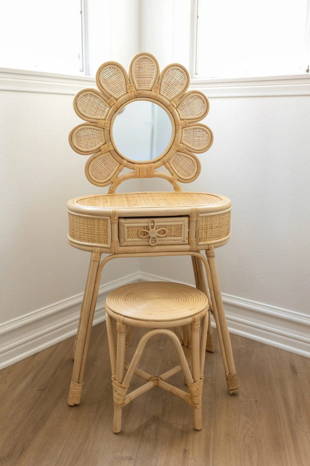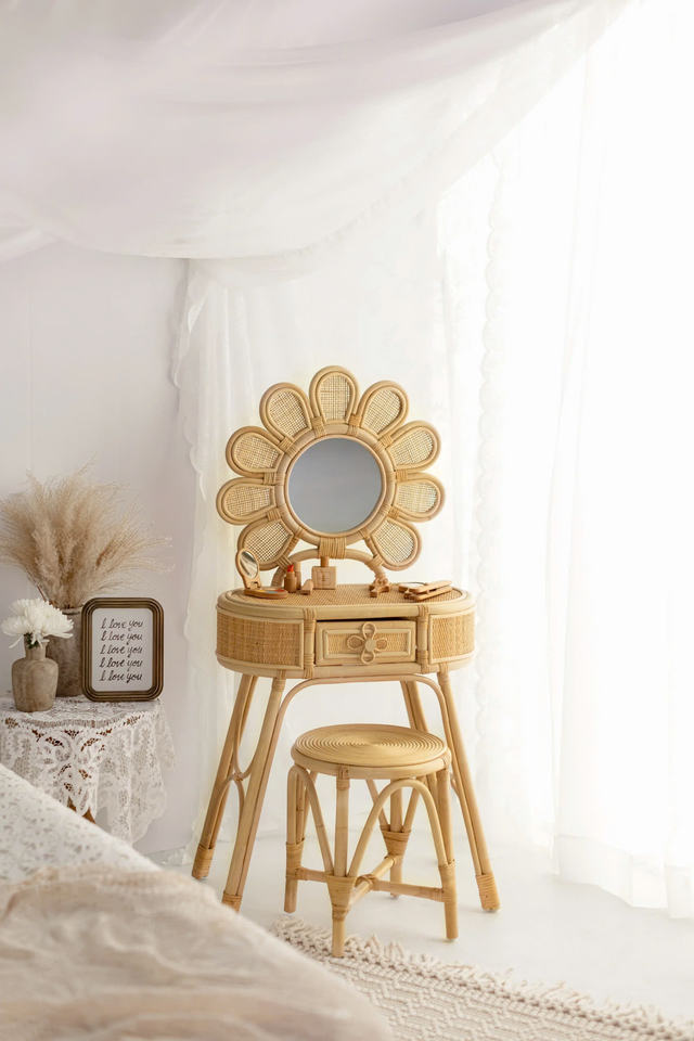 โต๊ะเครื่องแป้งรูปดอกไม้สำหรับเด็ก ทำจากหวายธรรมชาติ - ดีไซน์สวยงาม แข็งแรง ทนทาน สไตล์คันทรี่