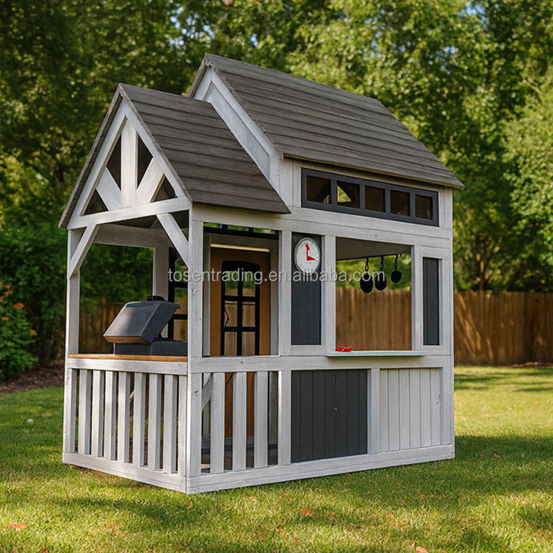 เต็นท์เด็กเล่นทรงกระท่อมสีขาว ทำจากไม้ซีดาร์จีนแท้ ของเล่นเสริมพัฒนาการสำหรับเด็ก พร้อมกระดานดำ รุ่นครัวกลางแจ้ง