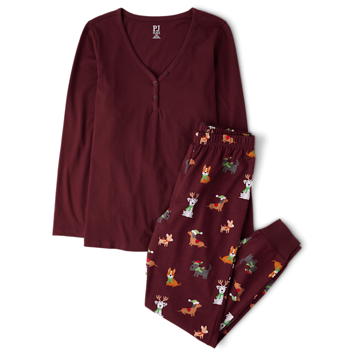 ชุดนอนผ้าฝ้ายสีแดงเบอร์กันดีสำหรับผู้หญิงจาก Childrens Place ได้รับการรับรองมาตรฐาน OEKO-TEX ระบายอากาศได้ดี ลายการ์ตูน เหมาะสำหรับวันหยุดพักผ่อนของครอบครัว ชุดนอนเข้าชุดกับสุนัข