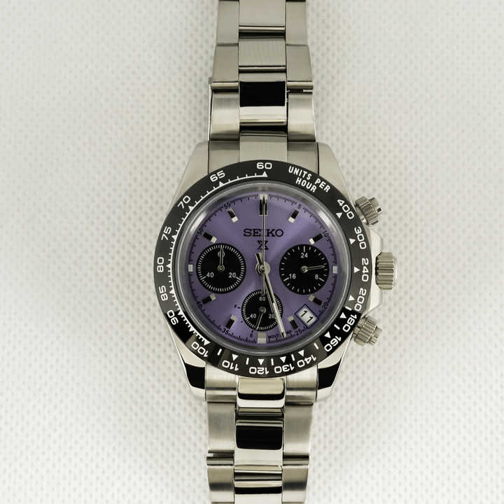 นาฬิกาควอตซ์สาย 20 มม. ผลิตในจีน ขายดี ตัวเรือนสแตนเลส หน้าปัดคริสตัลแซฟไฟร์ทรงกลม พร้อมโลโก้สั่งทำ สีม่วง