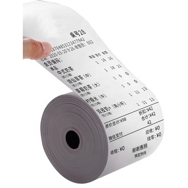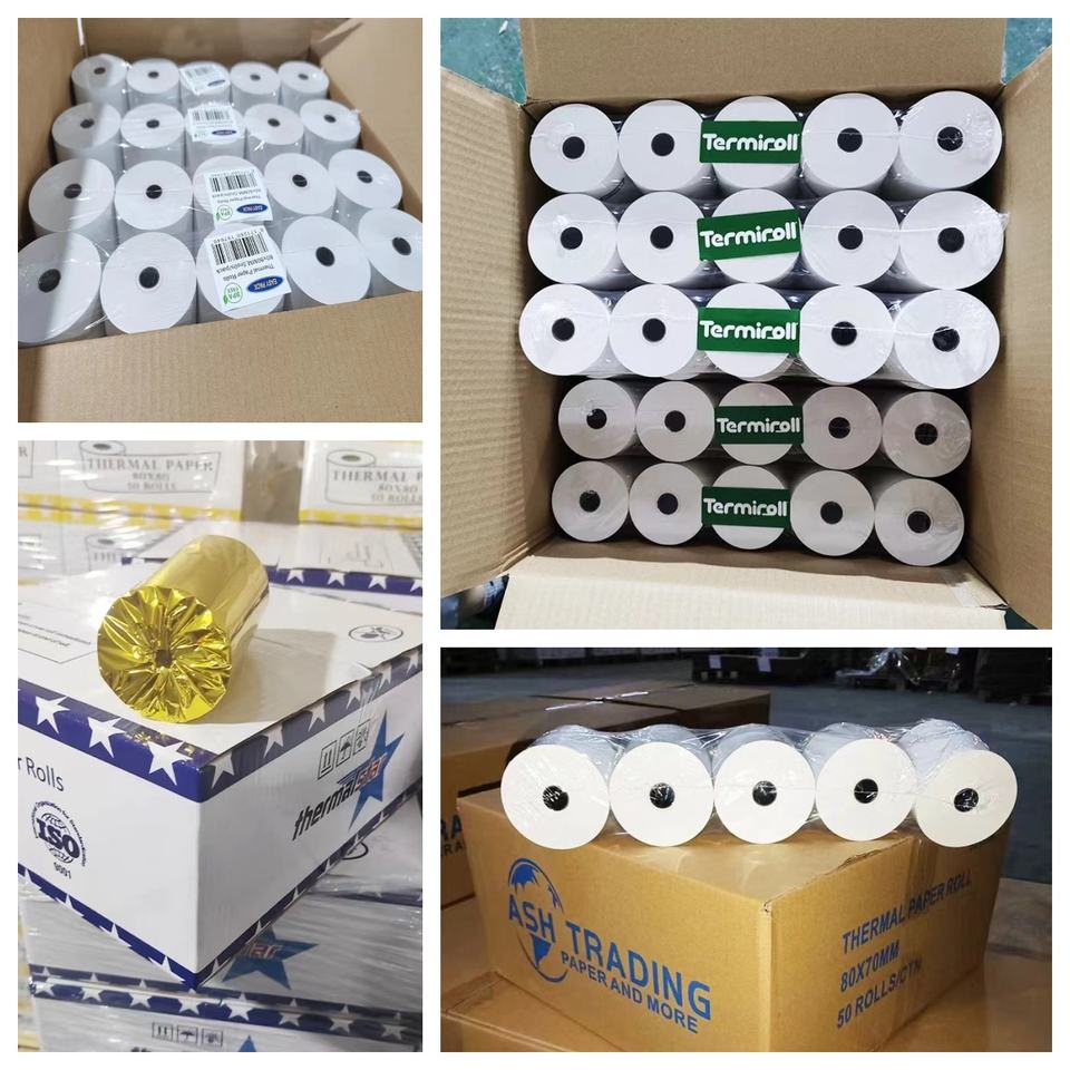 กระดาษม้วนความร้อนราคาโรงงานจีน ขนาด 57 มม. และ 80 มม. แบบชั้นเดียว ผลิตจากเยื่อไม้บริสุทธิ์ 100% สำหรับเครื่อง POS/ATM และเครื่องบันทึกเงินสด