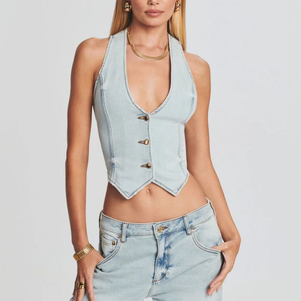 เสื้อกั๊กยีนส์แบบครอปติดกระดุม ดีไซน์เก๋จากโรงงานจีน ขายส่งเสื้อกั๊กยีนส์ผู้หญิง