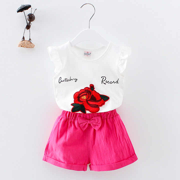 ชุดเสื้อยืดแขนสั้นสีขาวลายดอกกุหลาบจีน กางเกงขาสั้น สำหรับเด็กทารกและเด็กผู้หญิง