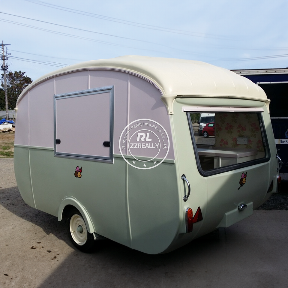 รถขายอาหารเคลื่อนที่ขนาดเล็กจากจีน โครงสร้างไฟเบอร์กลาสและอะลูมิเนียม สำหรับขายขนม ไอศกรีม และอาหารจานด่วน