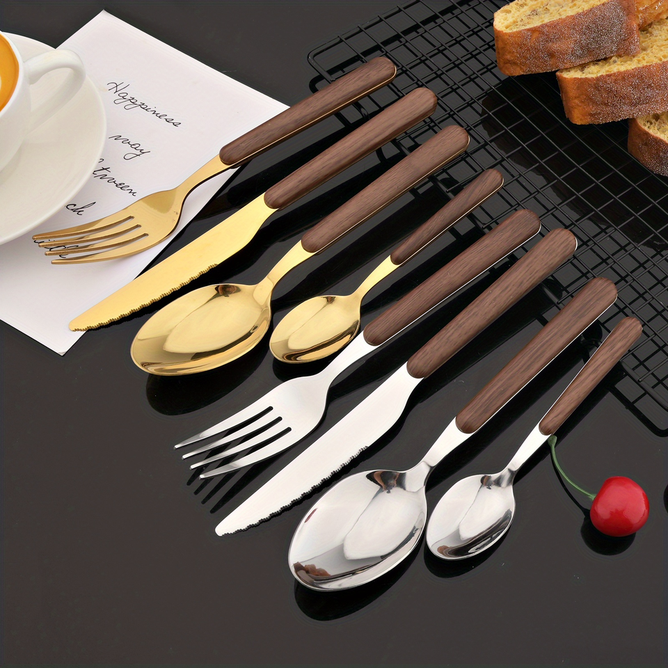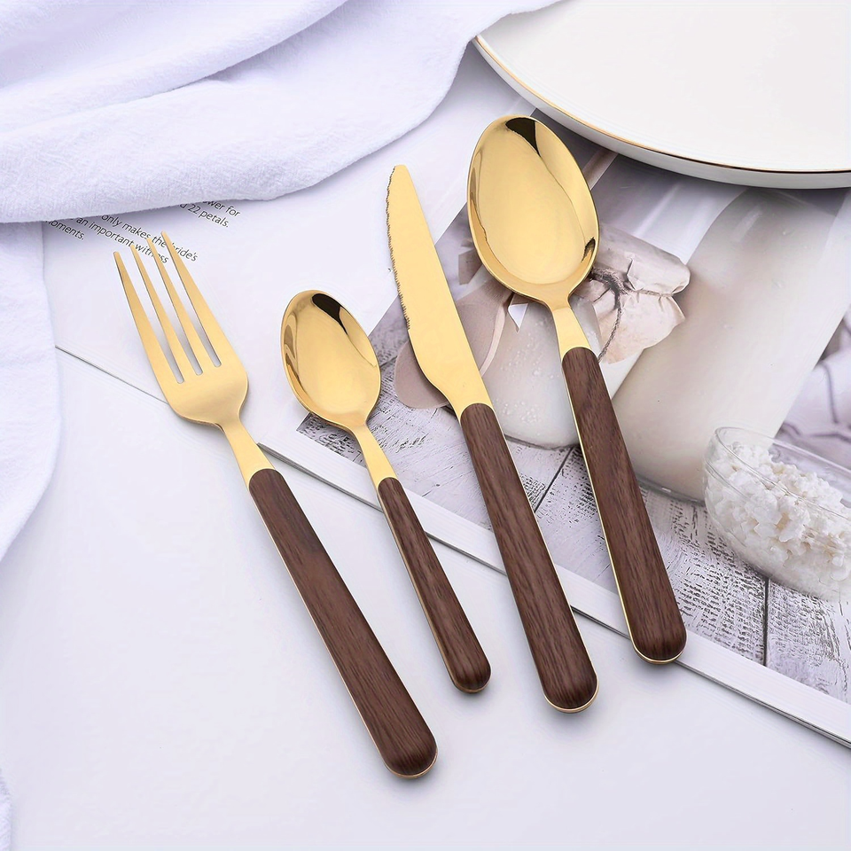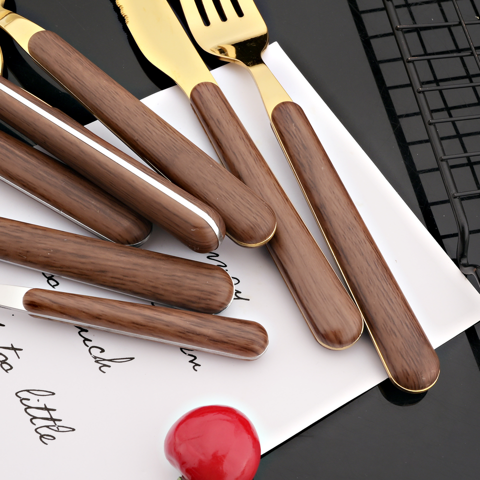 ชุดช้อนส้อมสแตนเลสสตีลทันสมัยจากจีน ด้ามจับไม้ ขัดเงาแบบกระจก ใช้งานได้กับเครื่องล้างจาน เป็นมิตรต่อสิ่งแวดล้อม มีด ส้อม ช้อน
