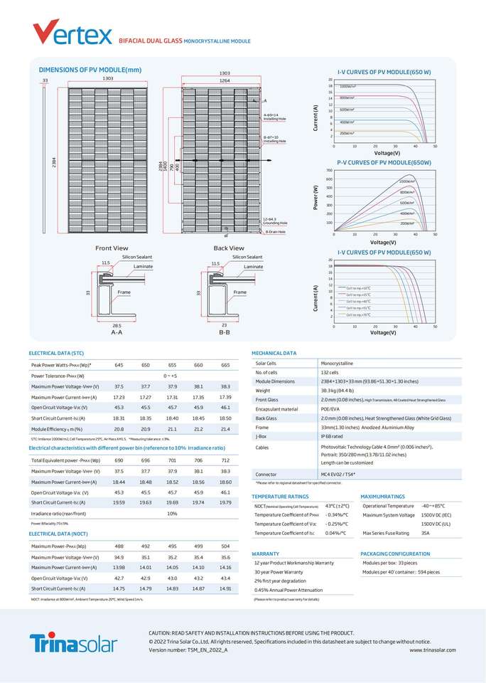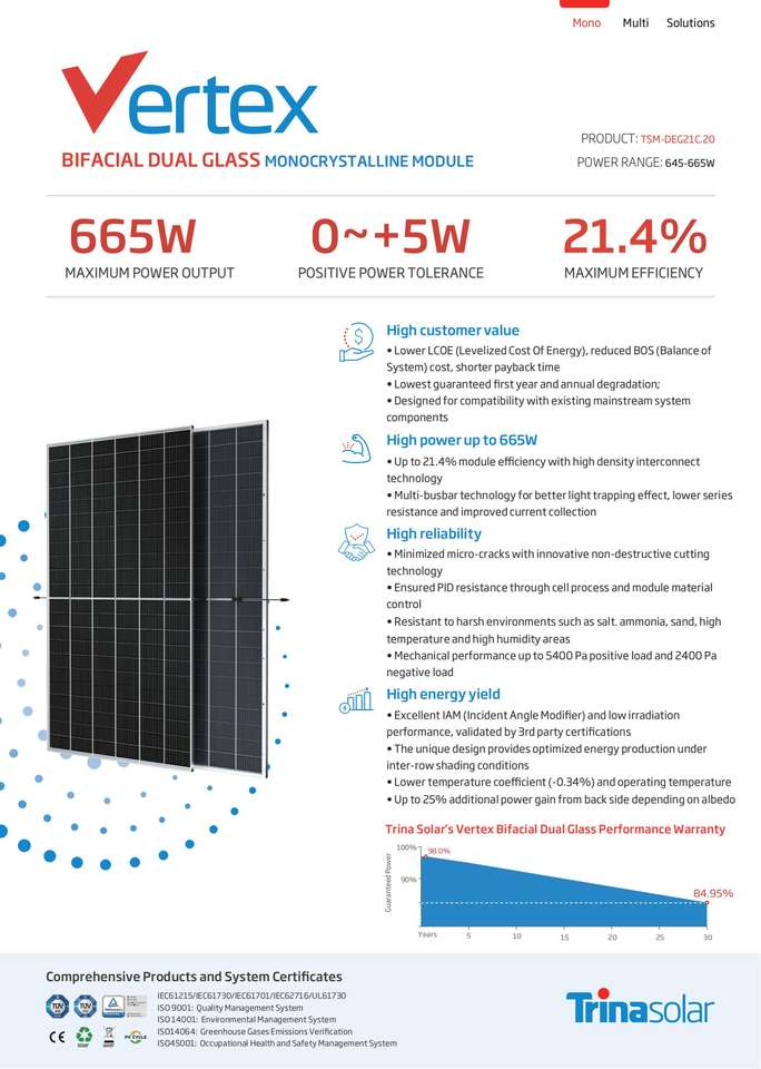 จีน Trina Vertex bifacial TSM-DEG21C แผงเซลล์แสงอาทิตย์เกรด655W 660W 665W กระจกสองชั้นขนาด20 645W 650W
