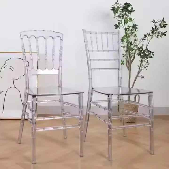 เก้าอี้พลาสติกใสแบบซ้อนได้สำหรับงานจัดเลี้ยงโรงแรม งานปาร์ตี้ และงานอีเว้นท์ ผลิตจากอะคริลิกใส วัสดุพีซี นำเข้าจากจีน