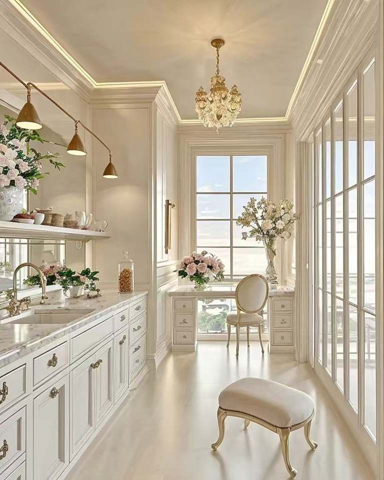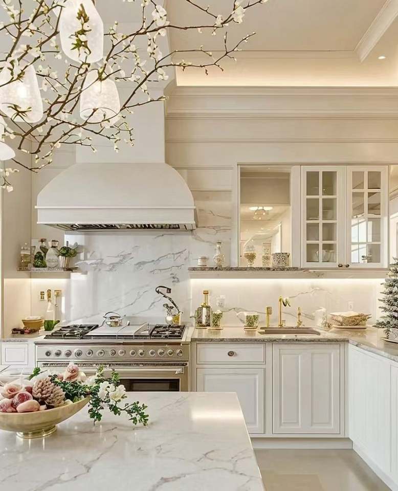 ตู้ติดผนังห้องครัวตู้ครัวแบบแยกส่วนเคลือบเงาสูงพร้อมเกาะห้องครัว