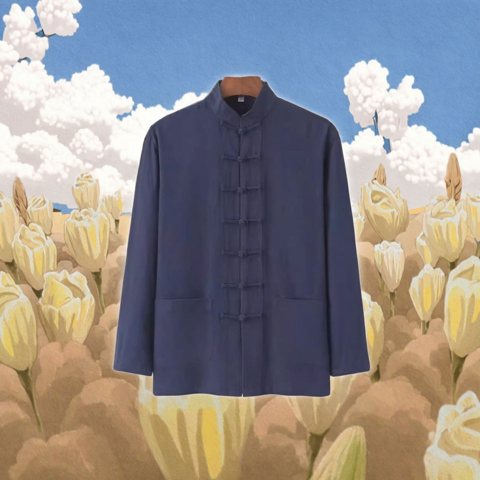 เสื้อเชิ้ตผู้ชายสไตล์จีน ผ้าโพลีเอสเตอร์ ยับยาก ระบายอากาศดี ปกคอพับติดกระดุม แขนยาว ทรงหลวม สวมใส่สบาย