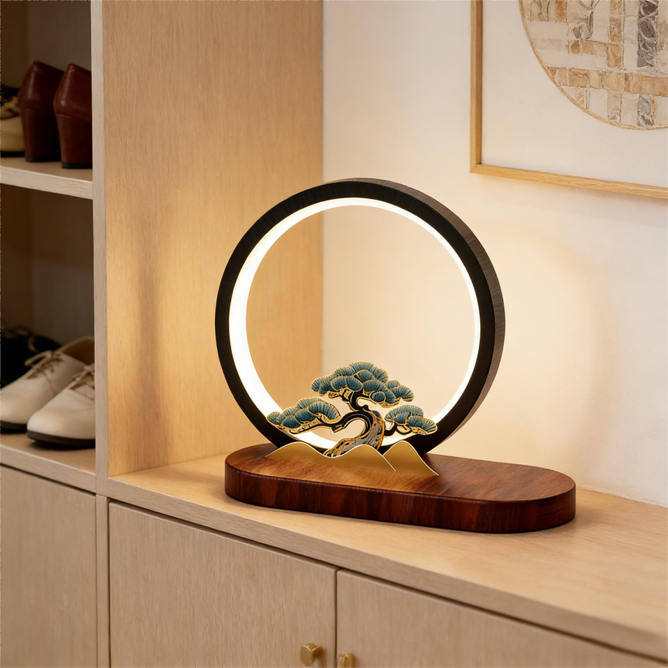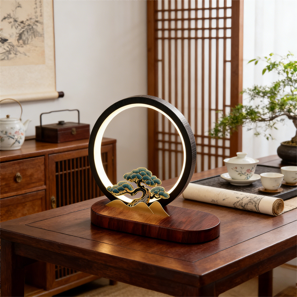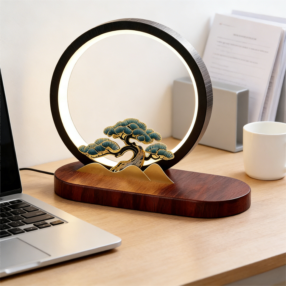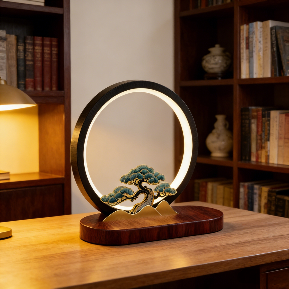 โคมไฟตั้งโต๊ะวงแหวน LED โลหะอะลูมิเนียมสไตล์จีน พร้อมระบบชาร์จไร้สายและโลโก้สั่งทำพิเศษ